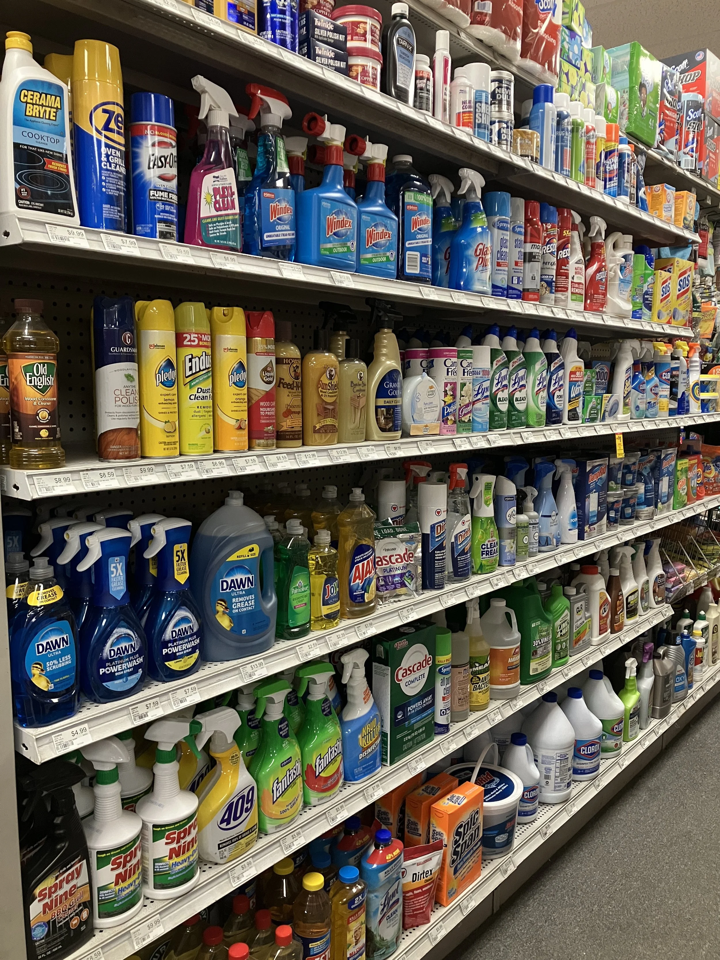 A small aisle of cleaning supplies at a hardware store.